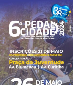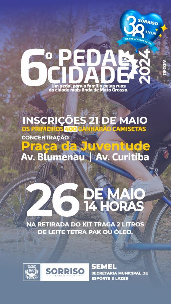A Prefeitura Municipal, por meio da Secretaria de Esporte e Lazer (Semel), divulga nesta quarta-feira (22) a abertura das inscrições para o 6º Pedal da Cidade, que será sediado no próximo domingo, 26 de maio, em Sorriso. Os primeiros 400 inscritos receberão a camiseta do evento.