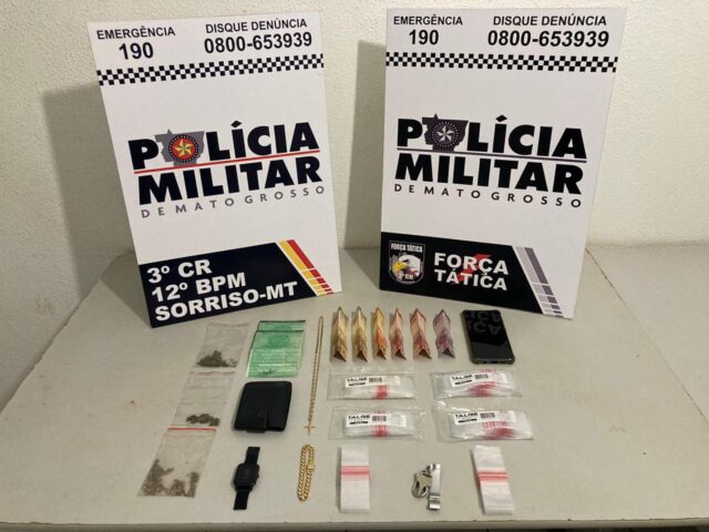 Com o suspeito foram encontrados 145,00 Reais em Moeda Nacional, duas porções de Substância Análoga a Maconha, uma porção de sementes aparentando ser de substância análoga a Maconha, um celular de marca Redmi, uma corrente com Pingente de cor Dourado, uma Pulseira de Cor Dourado, entre outras coisas.