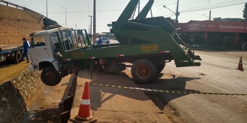 Segundo o condutor, ele estacionou o veículo do outro lado da rua e foi receber uma nota em um estabelecimento próximo. Neste período o freio do caminhão deve ter desengatado e o veículo acabou descendo o declive, atravessando a rua e caindo dentro de uma vala.