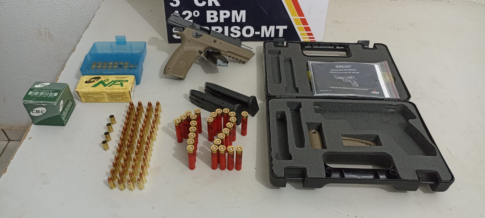 A Polícia foi acionada, onde assim, ao comparecer no local, o sujeito também apontou a arma para a guarnição, momento esse que realizaram a prisão do indivíduo.