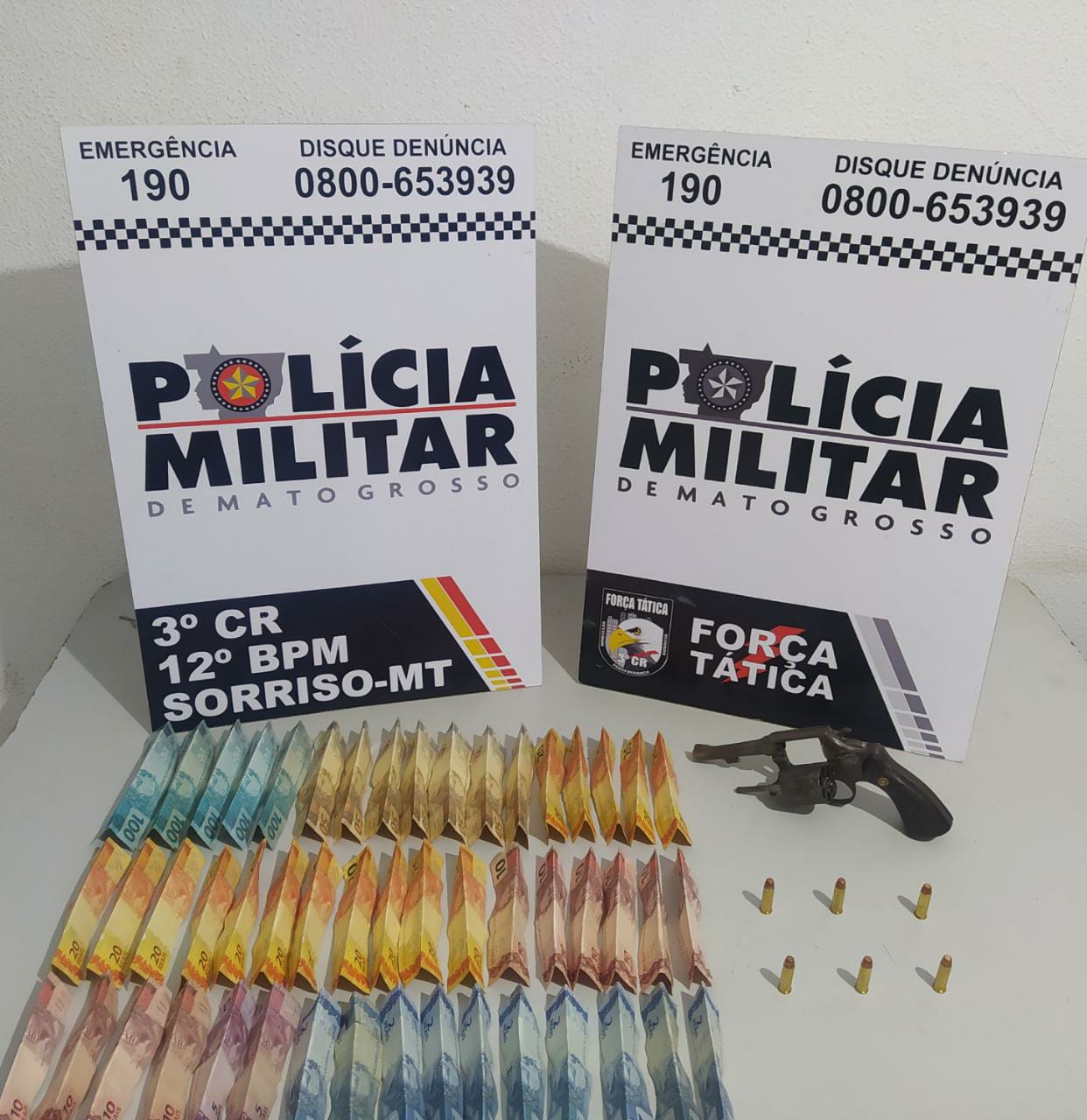 De imediato a guarnições se deslocou até o local indicado, onde localizaram o suspeito que durante a busca pessoal foi encontrado uma quantia em dinheiro e um Revólver calibre .38 carregado com 06 munições na cintura do suspeito.
