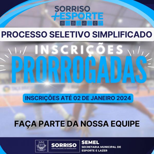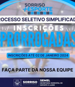 As inscrições para o Processo Seletivo Simplificado nº 003/2023, da Secretaria de Esporte e Lazer (Semel), foram prorrogadas até o dia 02 de janeiro, de 2024. O certame visa contratar, de forma temporária, 48 profissionais, das áreas de Educação Física, Psicologia e de Nutrição, para o Programa Sorriso + Esporte, realizado na sede do Município, Distrito de Boa Esperança, Distrito de Primavera e Caravágio. O contrato será válido até 12 de dezembro, de 2024.
