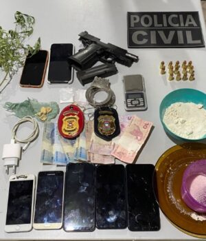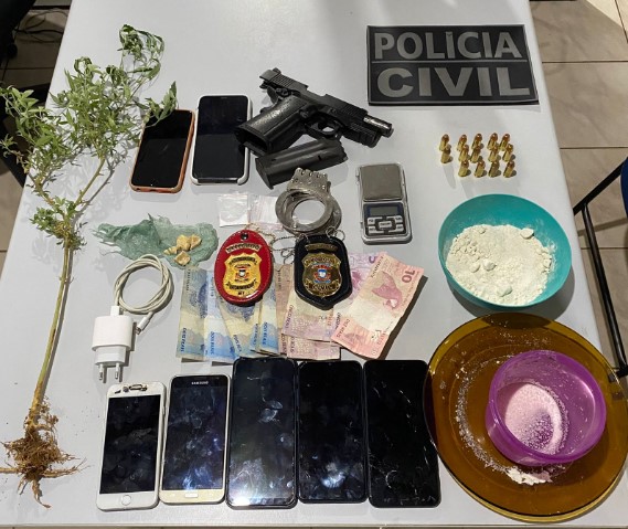 Ao todo foram cumpridos oito mandados de Busca e Apreensão Domiciliar, resultando na condução de 7 pessoas, sendo 6 maiores e um menor. Foi apreendido diversas drogas e ainda uma arma de fogo, calibre .40.