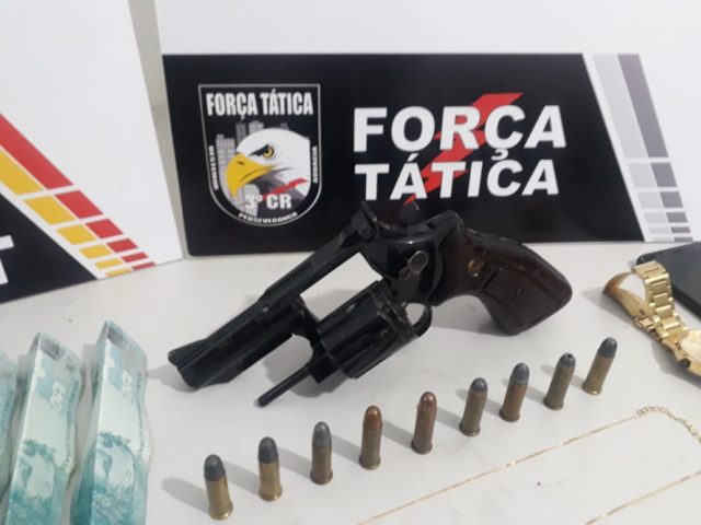 O suspeito foi abordado e o deslocar no endereço deste, no bairro São Domingos, a equipe localizou uma arma   calibre 38  e 09 munições  intactas.