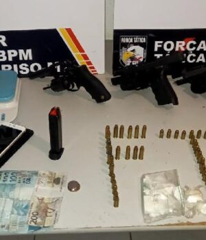 Policiais militares da Força Tática do 3º Comando Regional prenderam quatro homens e duas mulheres por porte ilegal de arma e tráfico ilícito de drogas, na noite desta sexta-feira (11.11), em Sorriso. Com os suspeitos, a PM apreendeu três armas de fogo, munições e porções de entorpecentes.