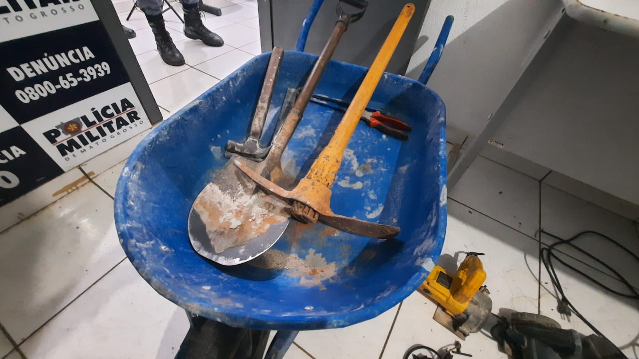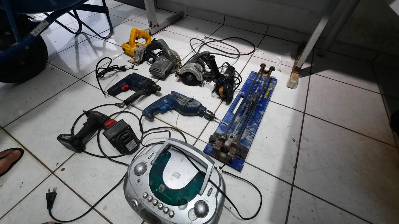 Em buscas dentro da residência, a PM encontrou mais alguns objetos com características de furto, sendo eles ferramentas para construção, furadeiras, serras elétricas, cortador de piso, dois celulares, drogas, dinheiro trocado e entre outras coisas.