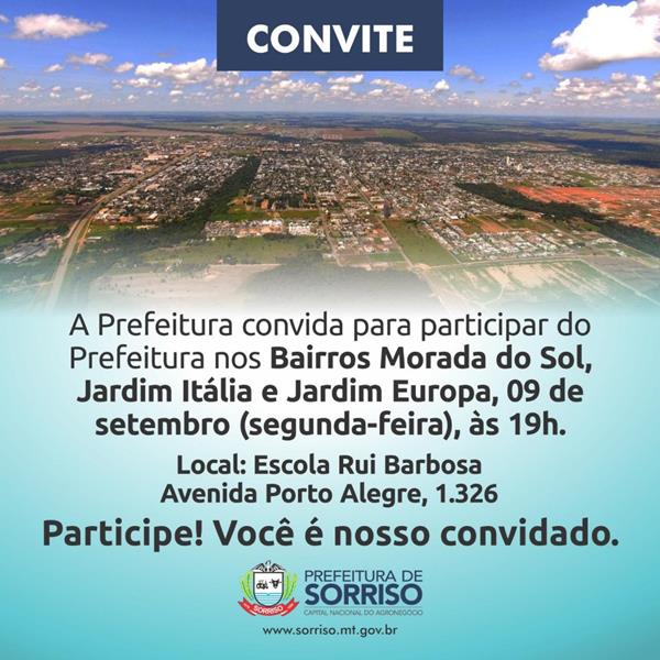 Hoje (09), os moradores do bairros Morada do Sol, Jardim Itália e Jardim Europa terão a oportunidade de dialogar com o prefeito de Sorriso, Ari Lafin e com o vice-prefeito Gerson Bicego, em mais uma edição do “Prefeitura nos Bairros”.
