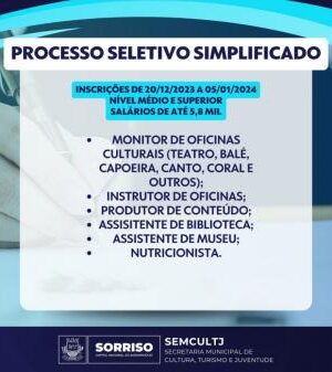 A Prefeitura de Sorriso divulgou nesta segunda-feira (8) o resultado das inscrições deferidas do Processo Seletivo Simplificado (PSS) da Secretaria de Cultura, Turismo e Juventude (Semcultj).