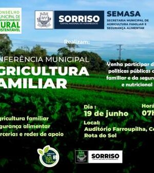 Estabelecer diretrizes via gestão participativa, e com isso fortalecer toda cadeia produtiva em pequenas e médias propriedades rurais de Sorriso. Essa é a proposta trazida pela Secretaria de Agricultura Familiar e Segurança Alimentar (Semasa), por meio do Conselho Municipal de Desenvolvimento Rural Sustentável (CMDRS), para a 1ª Conferência Municipal de Agricultura Familiar que acontece nesta quarta-feira (19), das 7h às 18h, no Centro de Eventos Ari José Riedi.