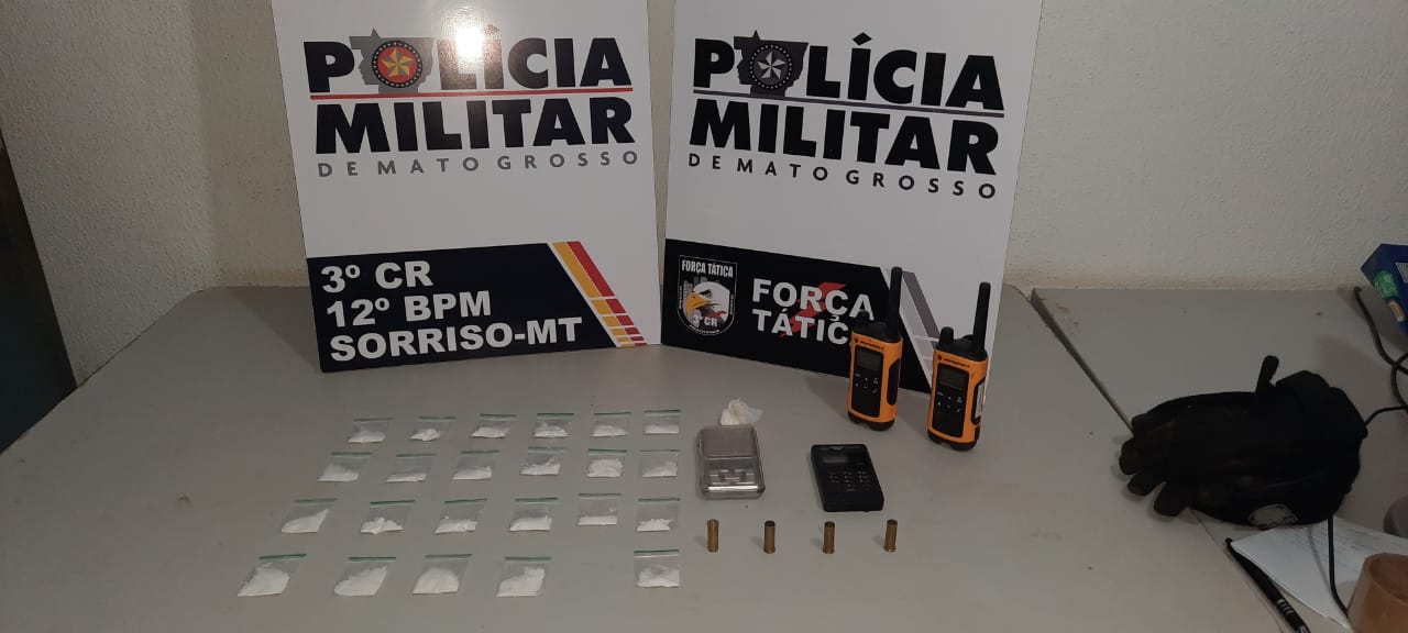 Em busca pessoal, a polícia encontrou quatro munições de calibre 38 deflagradas, onde ao deslocarem para a residência do mesmo, foram encontradas mais 23 trouxinhas análogas a cocaína, balança de precisão e algumas anotações. Em continuidade as buscas na parte externa da casa, foram encontrados em um barracão diversos produtos agrícolas sem nota fiscal.