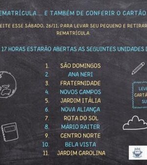 Entre os dias 1.º e 06 de dezembro as unidades escolares – escolas e Cemeis, irão realizar as rematrículas; o remanejamento entre unidades escolares deve ser feito nos dias 8 e 9 de dezembro. Já as matrículas novas serão realizadas nos dias 12 e 13 de dezembro. Para realizar a matrícula os pais ou responsáveis devem levar os seguintes documentos: cópia da certidão de nascimento; do cartão do SUS; comprovante de residência; documentos pessoais dos pais (RG e CPF); do comprovante de vacinação; e declaração de transferência ou histórico escolar. Hoje a rede pública de Sorriso atende cerca 17 mil alunos desde a educação infantil ao ensino fundamental.